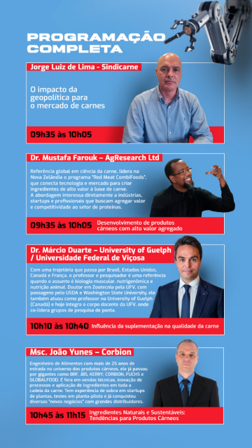 Ao longo da manhã, o evento propõe debates sobre os temas que vêm moldando o futuro da indústria da carne, em um cenário de mudanças aceleradas no mercado global e na competitividade do setor. A programação inclui cerimônia de abertura e palestras temáticas, além de um painel de discussões com convidados do segmento.